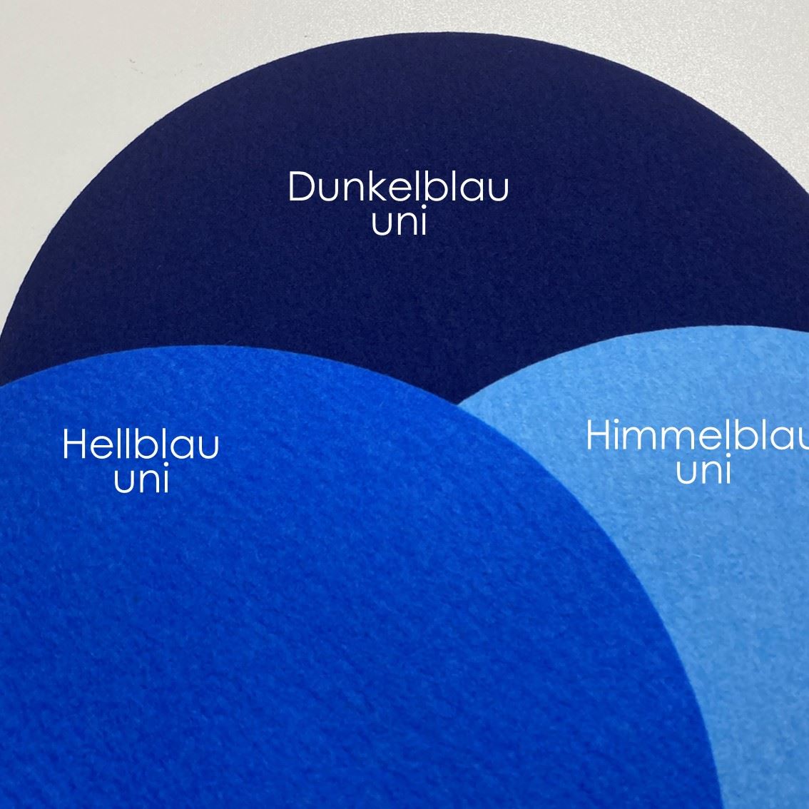 Ein Filz in Hellblau uni ist leuchtend, kräftig, auffallend und alles andere als dezent. Eine sehr farbenfrohe Kombination ergibt sich mit Maigrün uni.