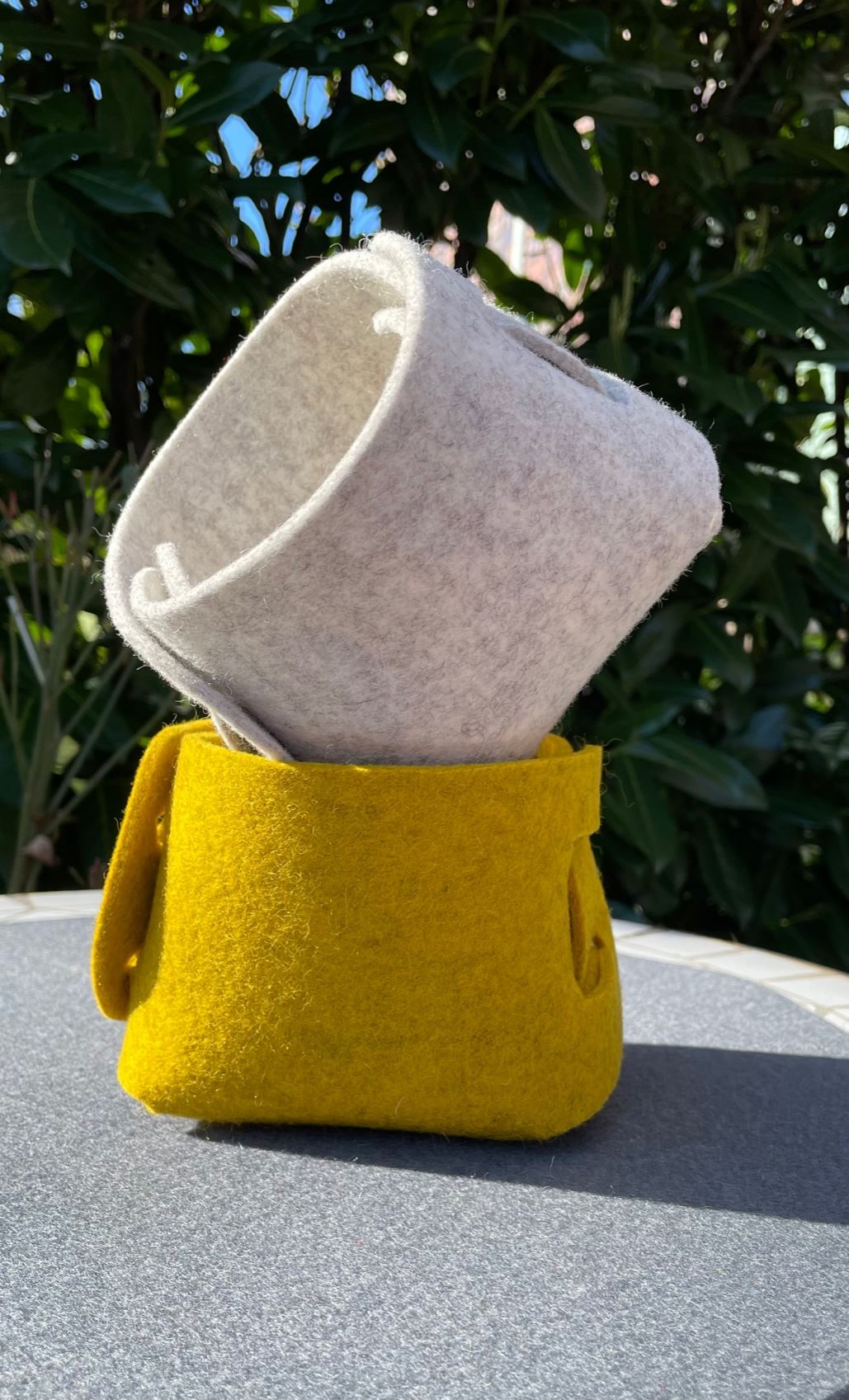 Was uns besonders gut gefällt? Das Körbchen wird rein aus Filz gefertigt, benötigt keine Knöpfe oder Bänder. Somit ist es deutlich sparsamer an Ressourcen. Das Körbchen wird einfach mithilfe von zwei Laschen und einer Falttechnik in Form gebracht.