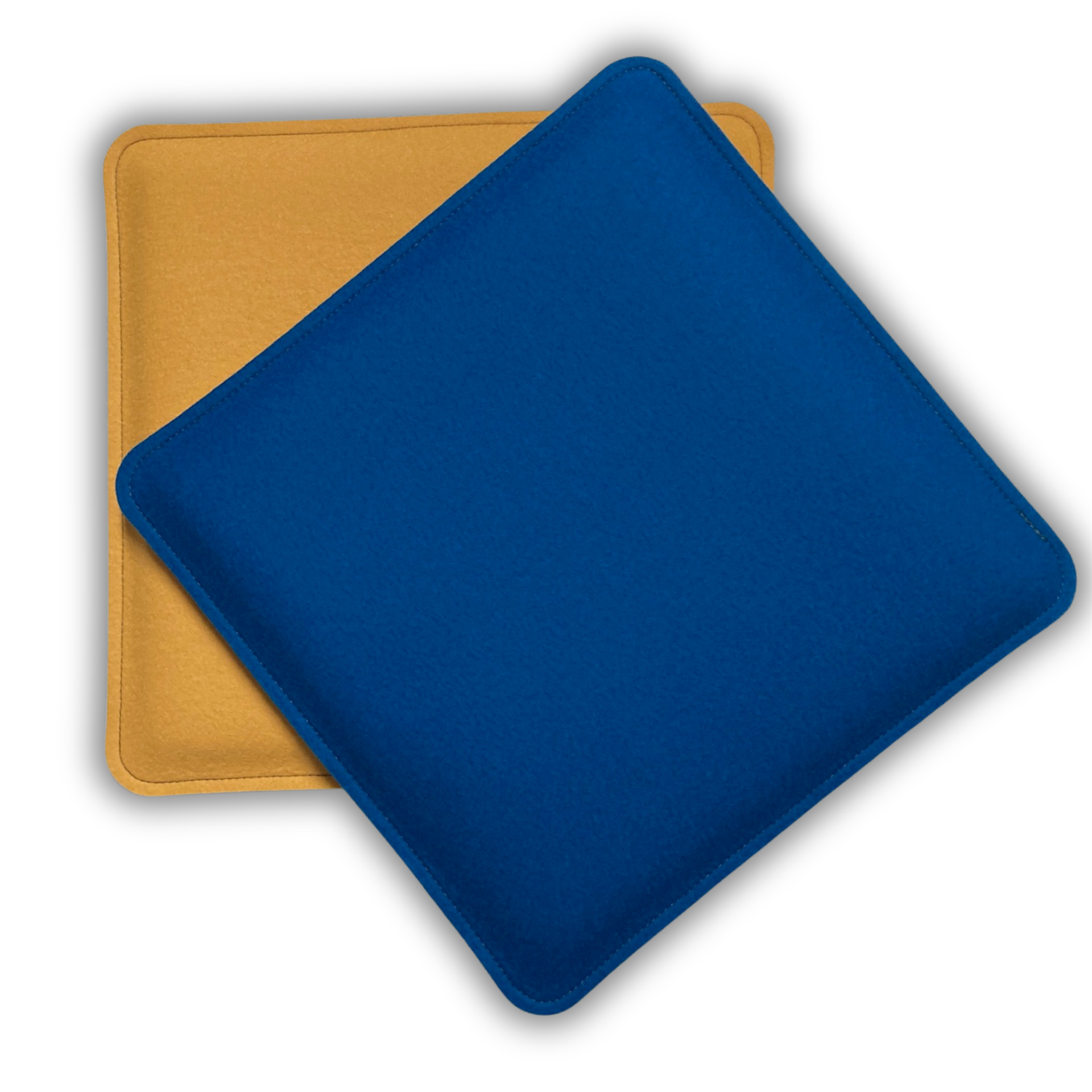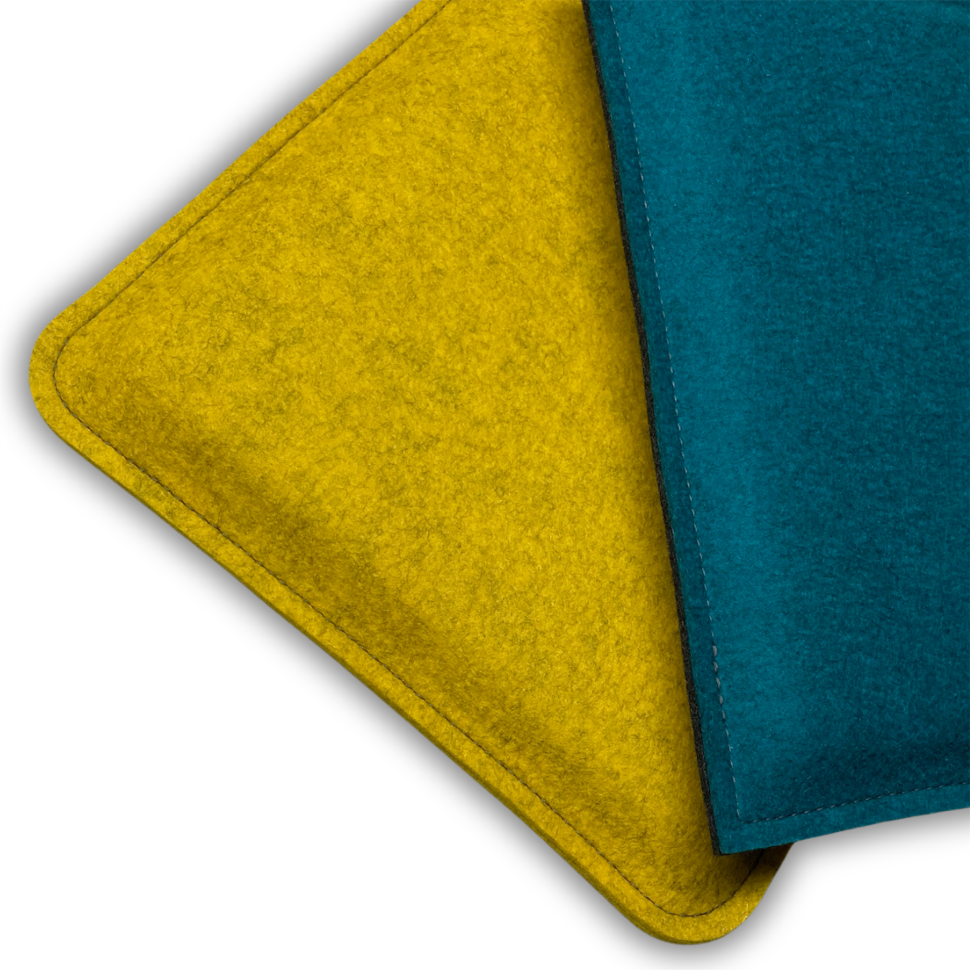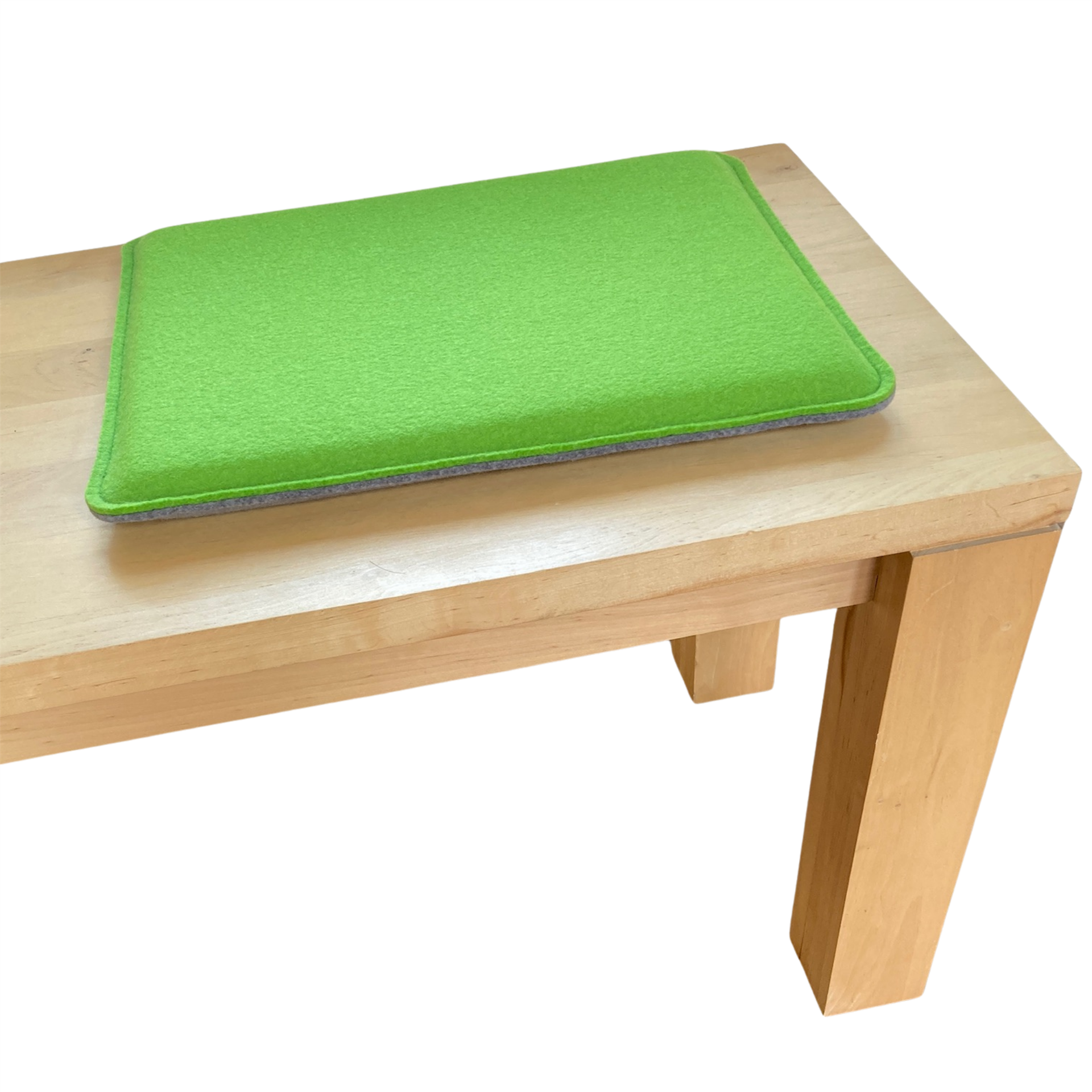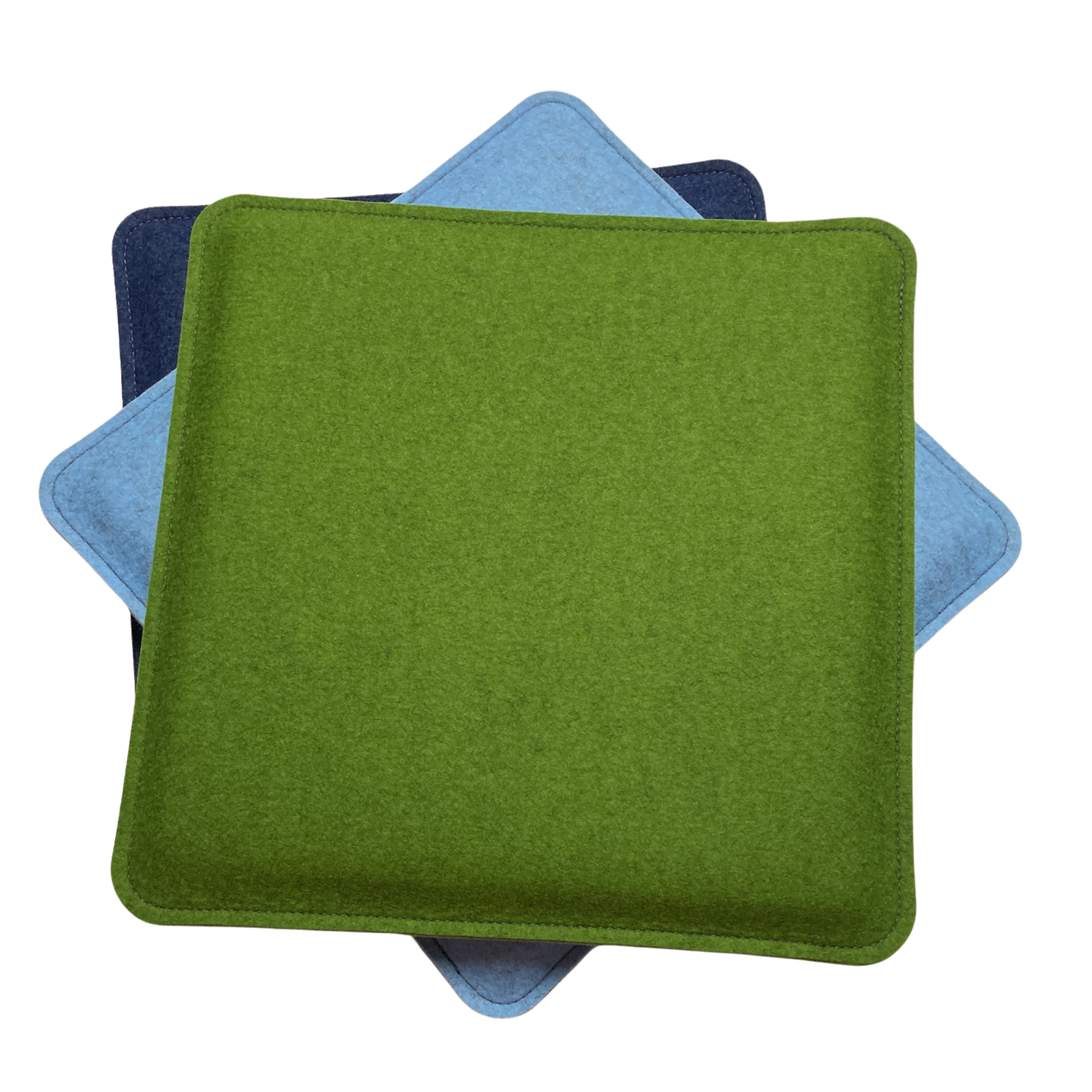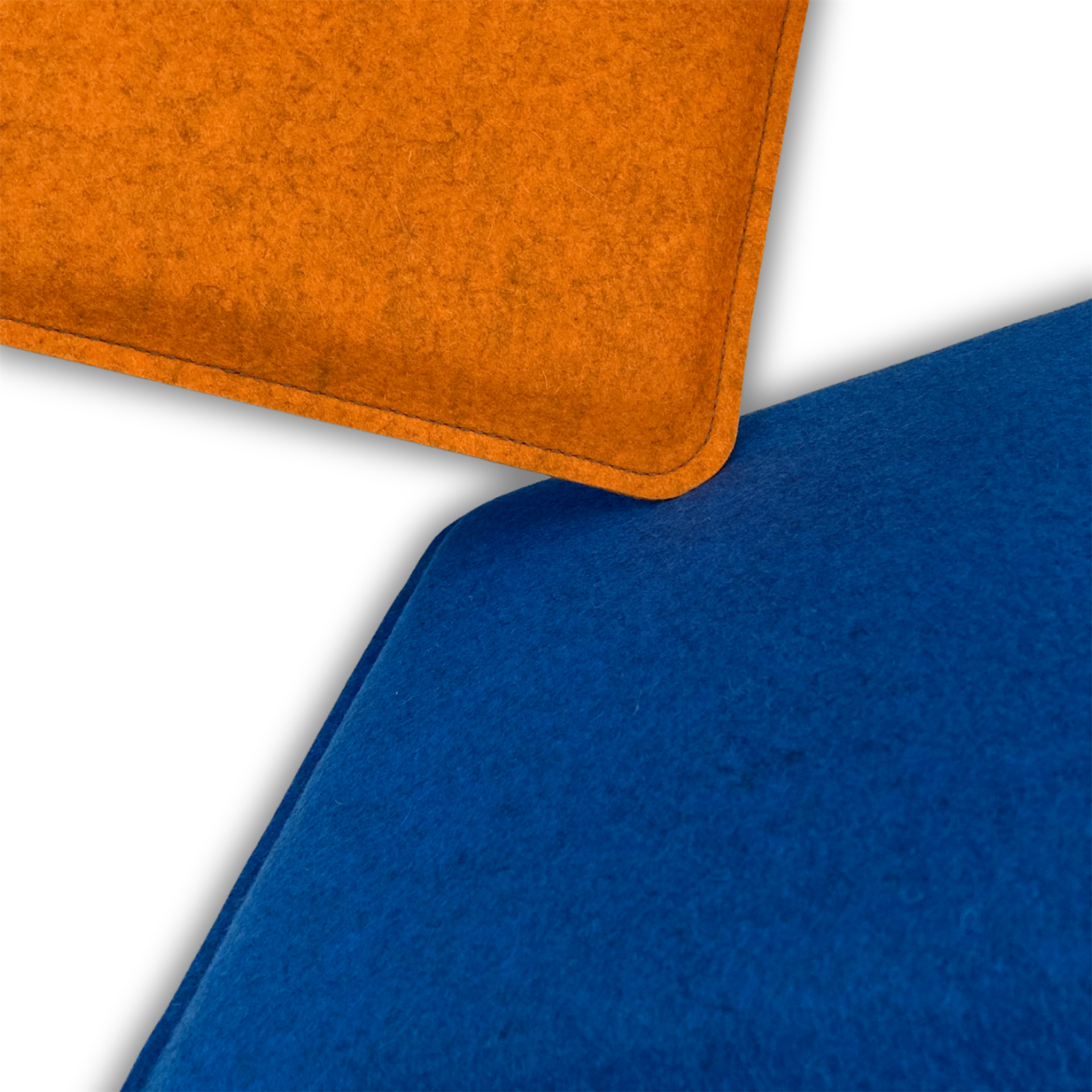 Wir beziehen den Filz seit Jahrzehnten von einem namhaften deutschen Hersteller. Der Filz besteht aus 100% Wolle (Merino - Schurwolle) in einer Materialstärke von 3 mm. Zwischen dem Filz wird als Polsterung ein 2 cm dicker Premiumschaumstoff vernäht.